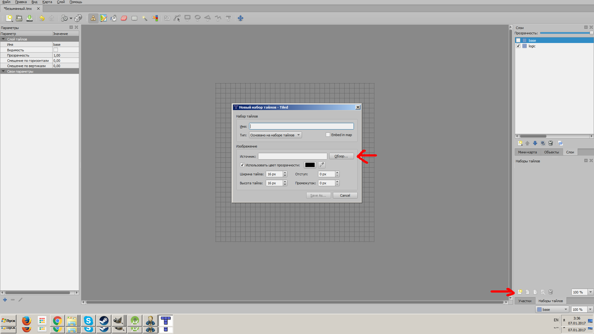 Сохраняем тайлсет под желаемым именем, после чего возвращаемся на вкладочку, где производится редактирование карты